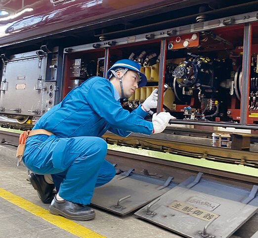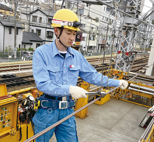 施設部門は土木・建築構造物や線路の保守管理、駅のバリフリ工事を担当、電気部門は信号通信設備・変電所・電車線路の保守や工事を担当、車両部門は車両の検査・保守や新車導入、改造業務を担当しています。