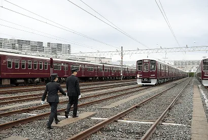 この日の業務は車庫からスタートします。運転士とともに車庫へ向かい、電車の異常がないか、車内外の点検を行います。