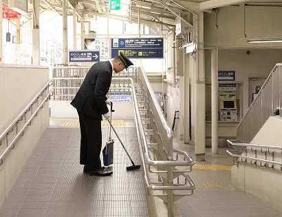 構内の清掃やポスター掲出、チラシの整理を行い、お客様に気持ちよく駅をご利用いただけるようにしています。また、ホームに赴き安全の点検も行います。
